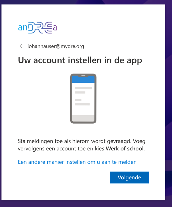 7. Select in Microsoft Authenticator app "Add account" > Work or School, click Next in the screen shown below