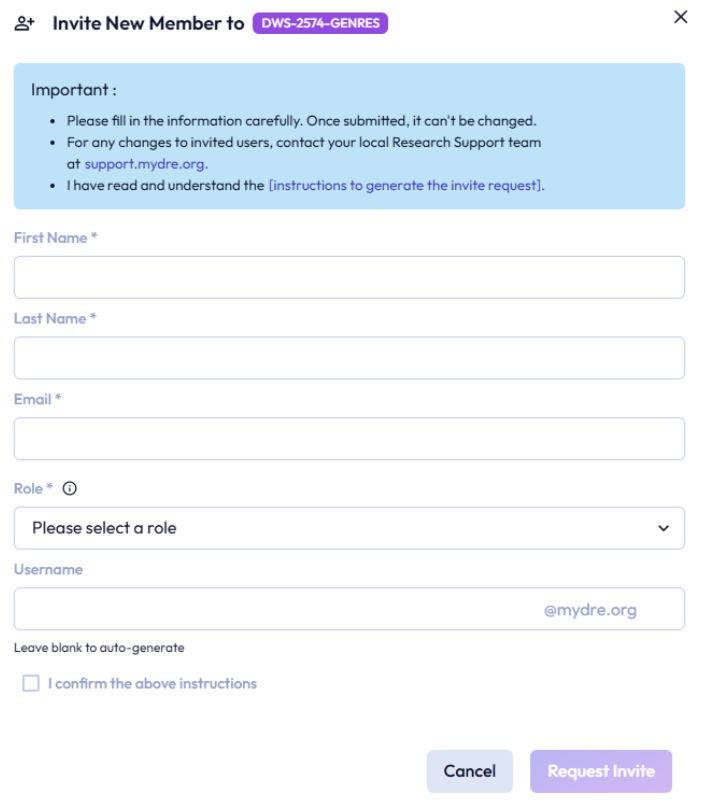 - After one or two working days the invited member will be given a myDRE account and will be added to the Workspace with the assigned role.