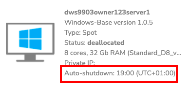 By default, all DRE VMs will be automatically shut down at 19:00 UCT +01:00 (Amsterdam, Brussels, Paris, etc). This auto-shutdown is there to prevent you from incurring unnecessary costs because you forgot to deallocate the VM(s). The auto-shutdown can also be adjusted by workpace