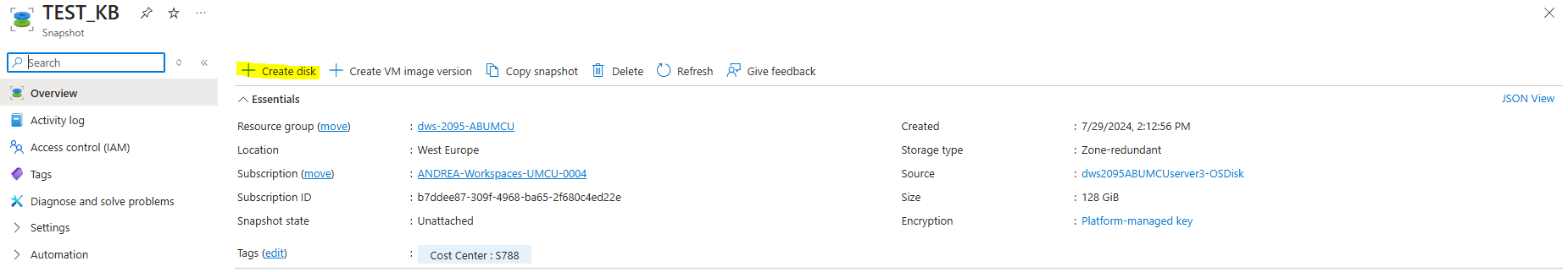 - You will find the OSDisk in the resource group, open it and click on +Create Snapshot. The snapshot must be located in the same resource group.