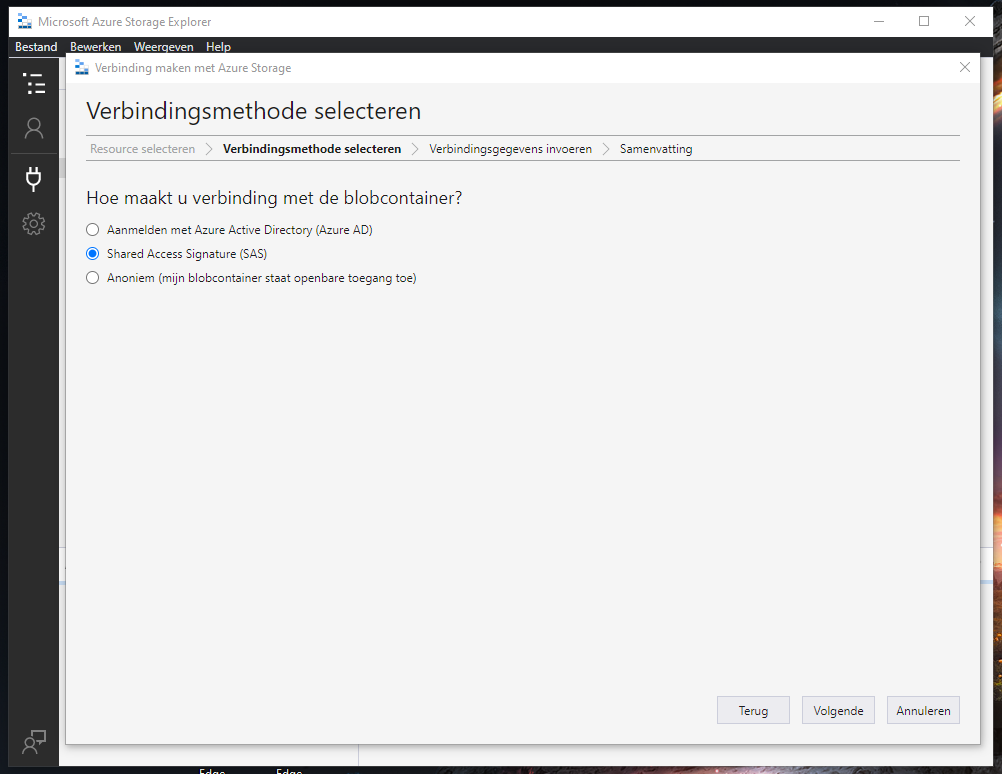 - Select the Shared Access Signature (SAS) option and click on Next.